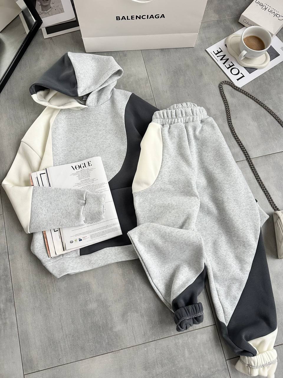 Сочетает в себе три цвета, очень теплый и удобный. Худи с капюшоном и карманом кенгуру. Брюки с карманами.