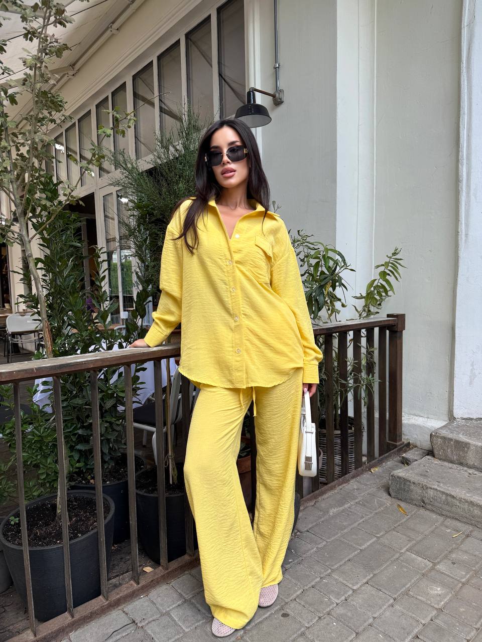Костюм из льна: рубашка+брюки на резинке с шнурком лимонный