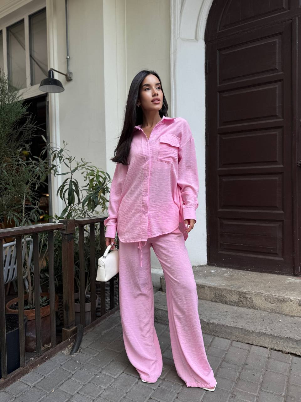 Костюм из льна: рубашка+брюки на резинке с шнурком розовый