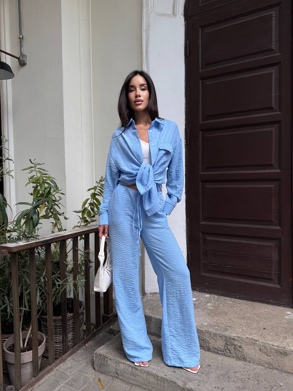 Костюм из льна: рубашка+брюки на резинке с шнурком голубой