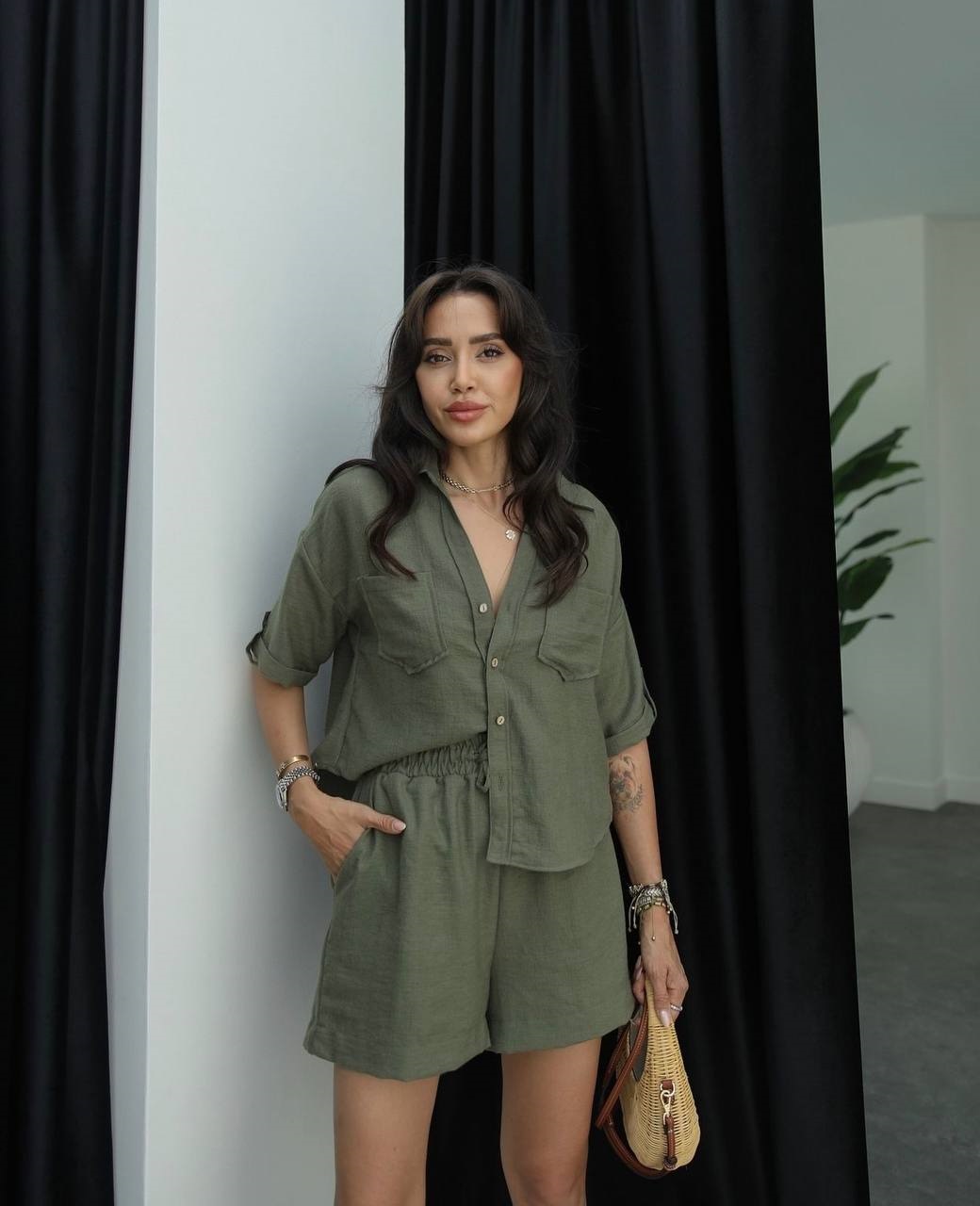 Головна » Магазин » Одяг » Жіночі костюми » Костюм из льна (шорты с карманами+рубашка с коротким рукавом+спущенным плечом) хаки