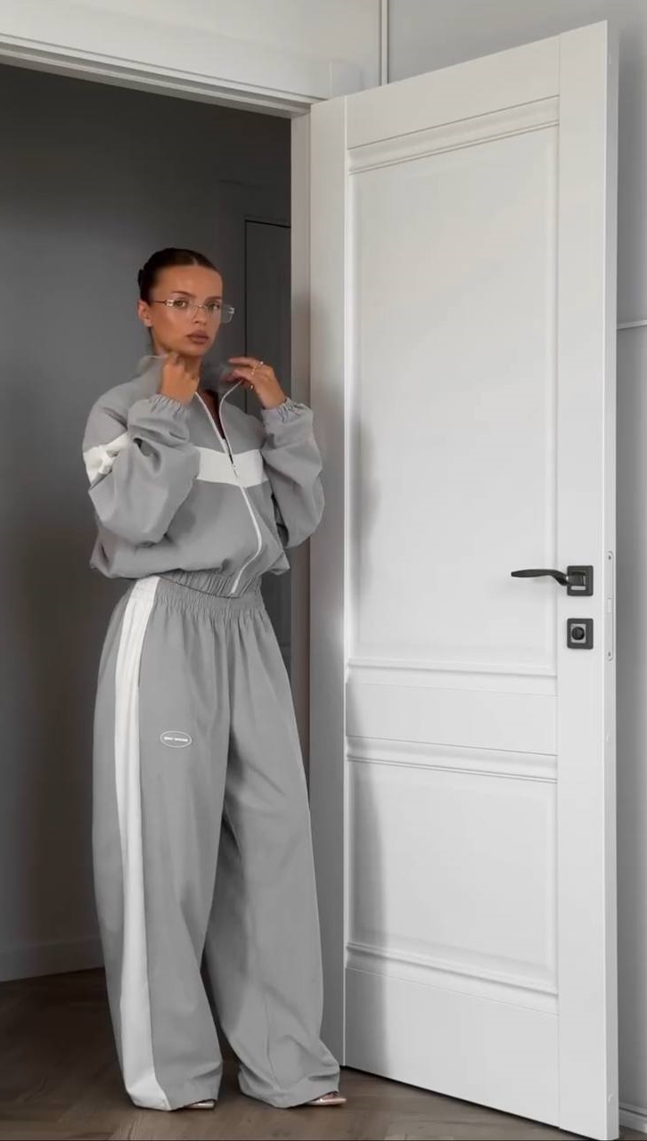 Костюм из мягкой плащевки оверсайз с яркими лампасами (джоггери+куртка на молнии) серый