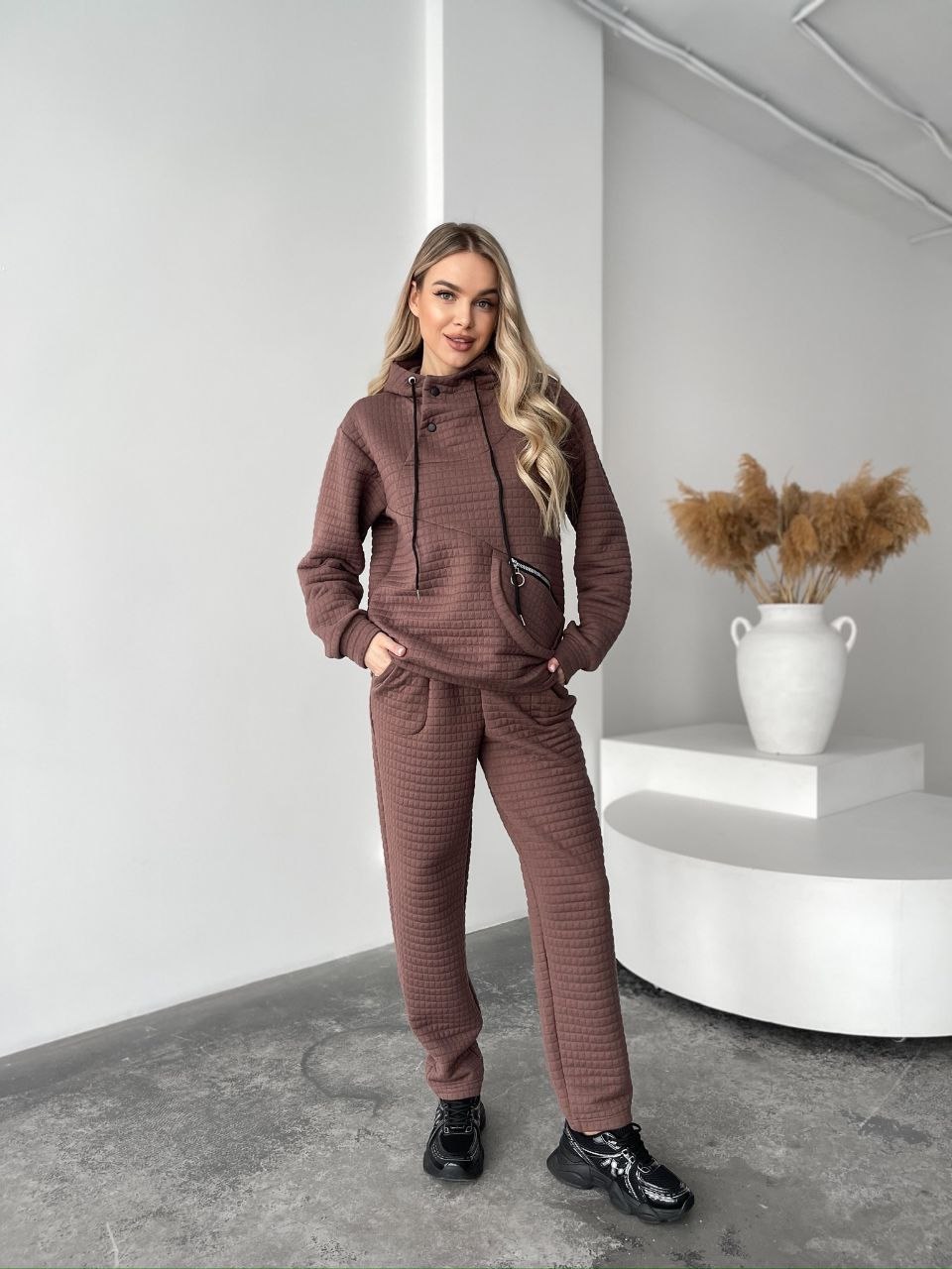 Костюм из стеганного трикотажа (брюки с карманами+худи с объемным карманом+капюшоном) шоколад