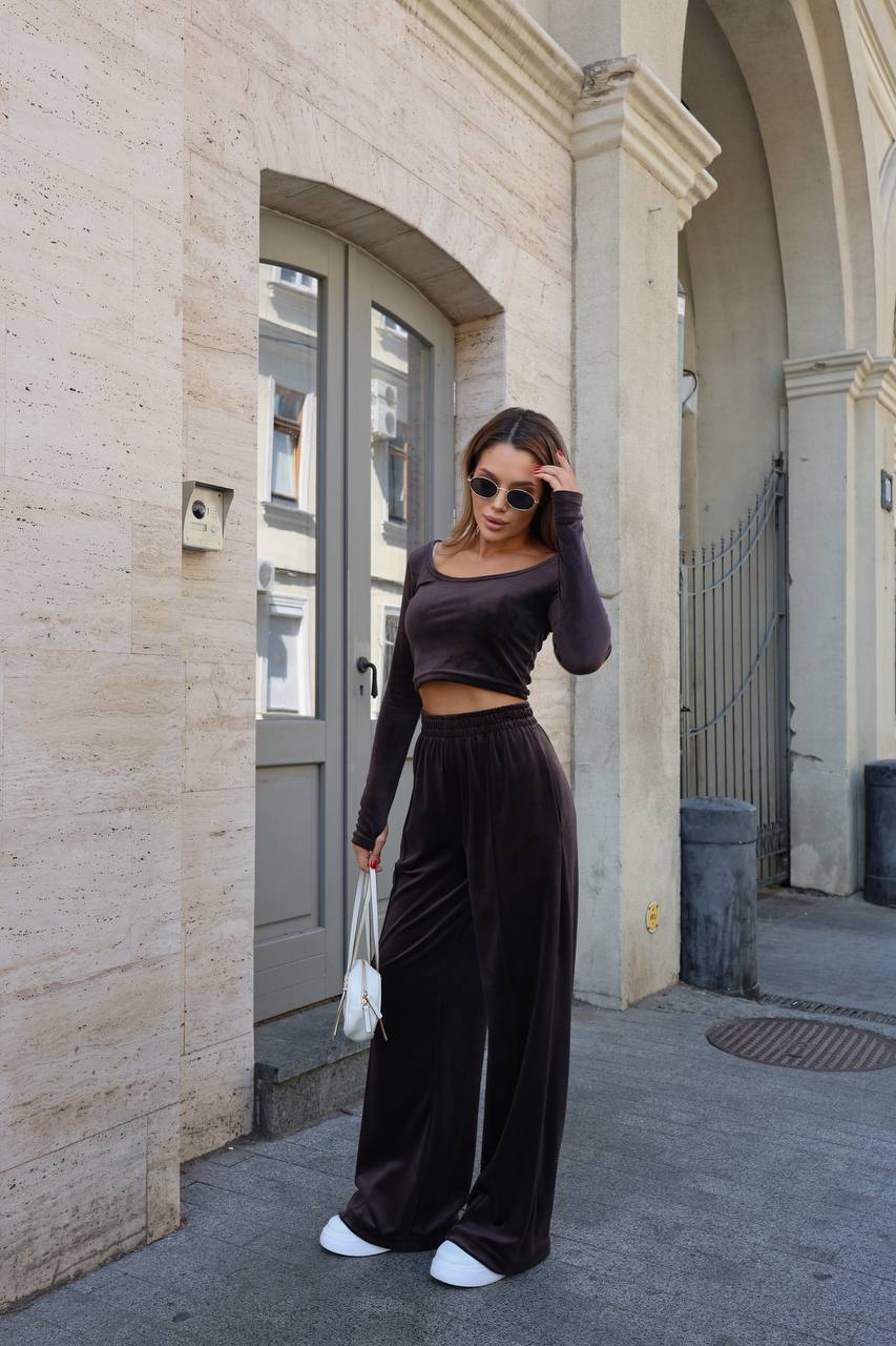 Костюм из велюра (Брюки палаццо+лонгслив с вырезом под пальчик) шоколад