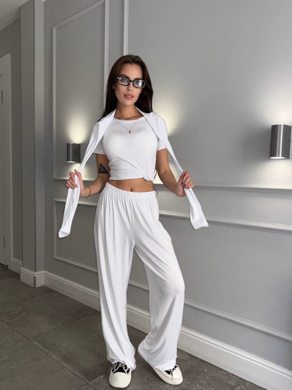 Футболка скимс, брюки палаццо свободного кроя и лонгслив с вырезами для пальчиков.