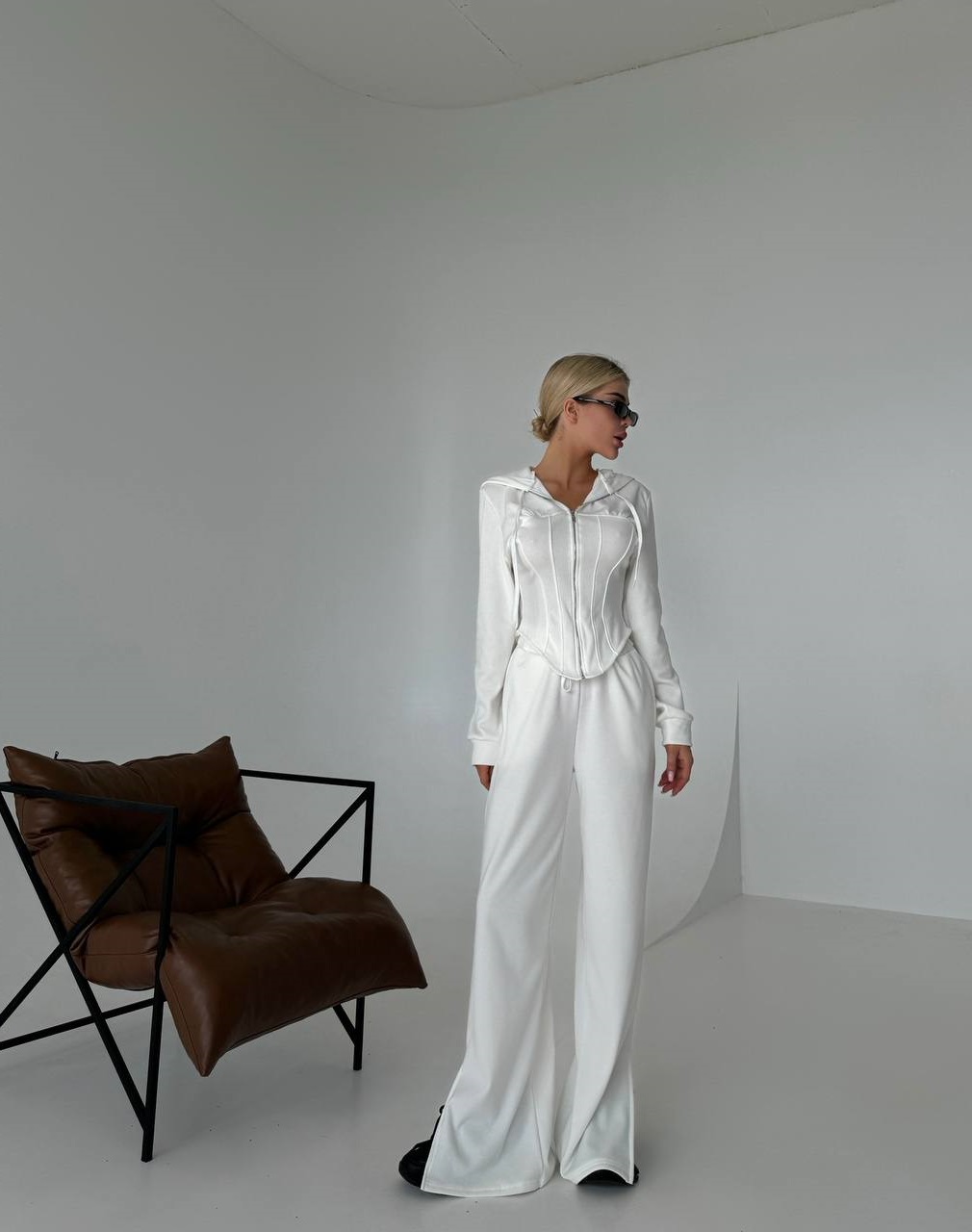 Очень комфортный костюм на флисе, приятная к телу ткань, не кашлатится. Брюки высокой посадки – имеют шнурок, прямой крой, внизу разрезы, что добавляет оригинальности. Кофта на металлической змейке, интересный крой – благодаря чему хорошо подчеркивает талию и делает ее визуально стройной.