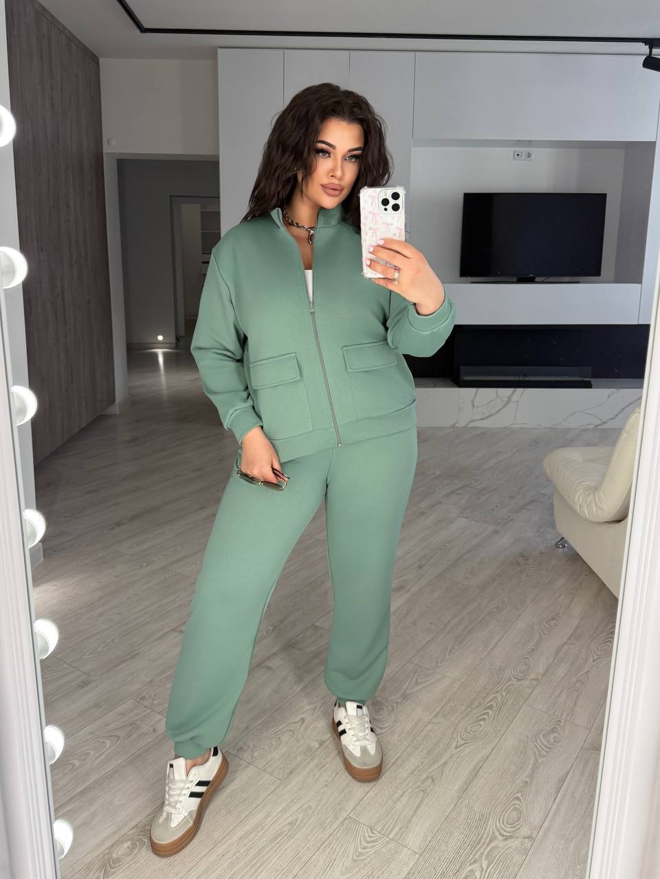 Костюм Кофта на молнии с длинным рукавом на манжете+Брюки высокой посадки оливка