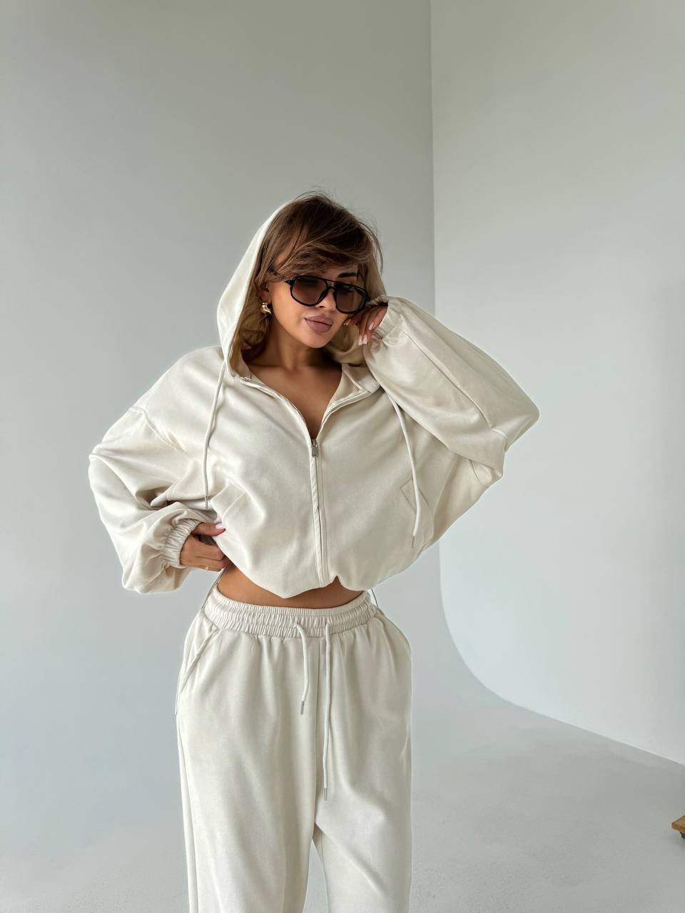 Костюм Кофта с двойным капюшоном на молнии+Брюки широкие молоко