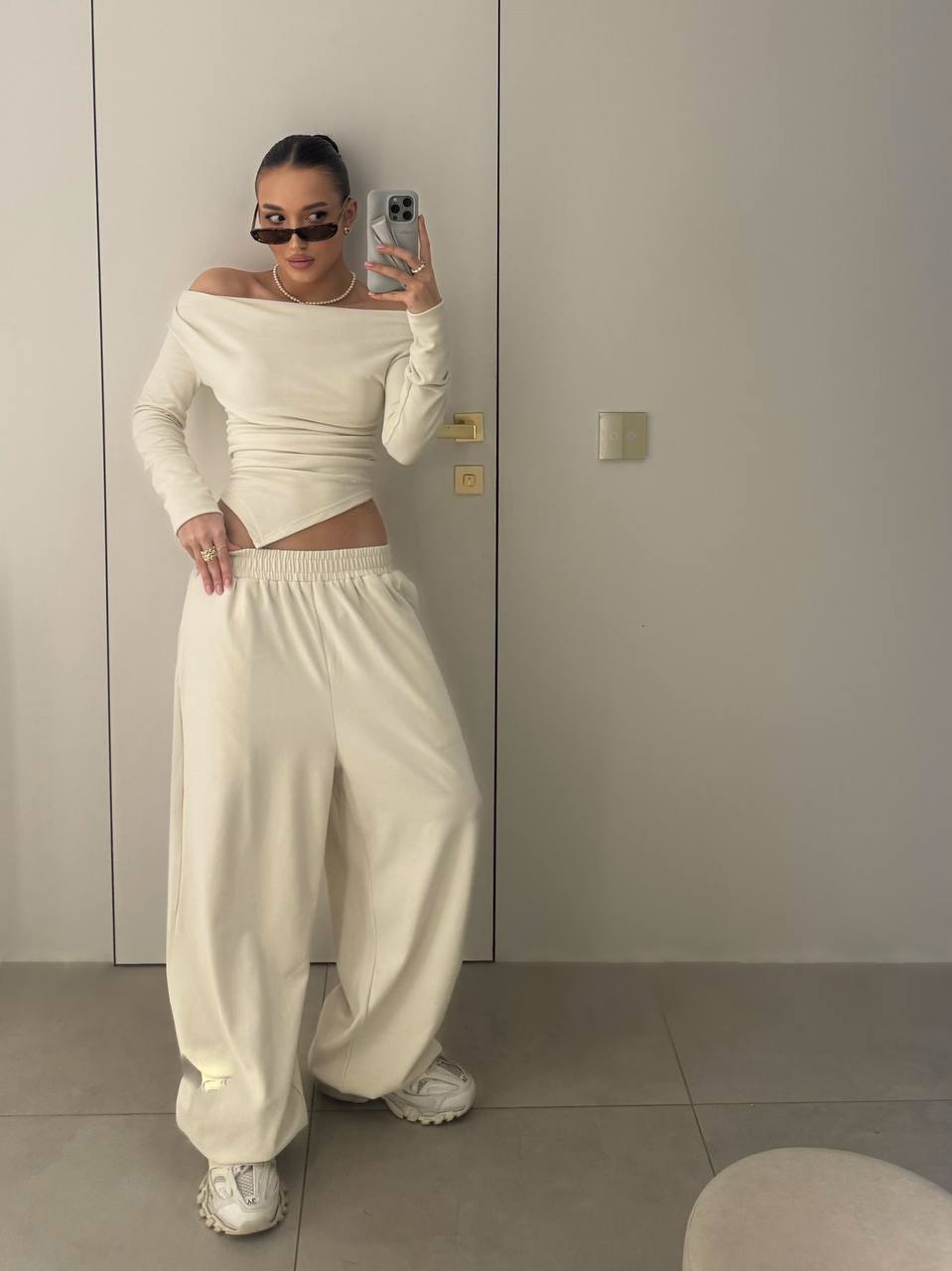 Костюм: Кофта со спущенными плечами+Брюки широкие молочный