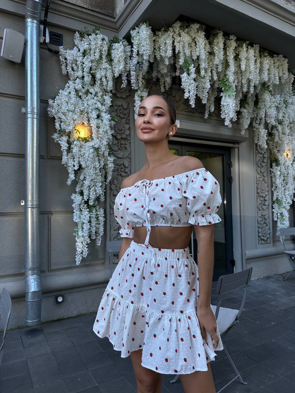 Головна » Магазин » Одяг » Жіночі костюми » Костюм короткий топ с юбочкой КЛУБНИЧКА белый