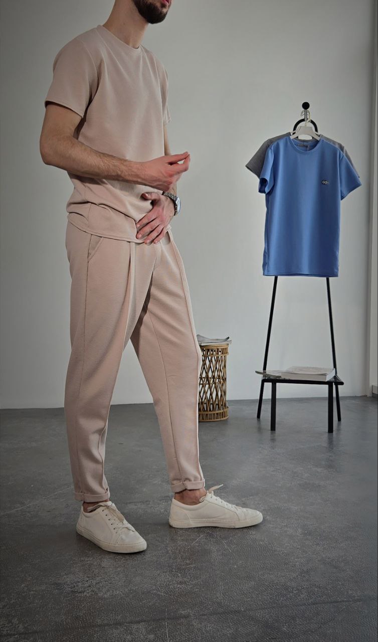 Костюм мужской: Футболка с фактурной текстурой+брюки с боковыми карманами беж