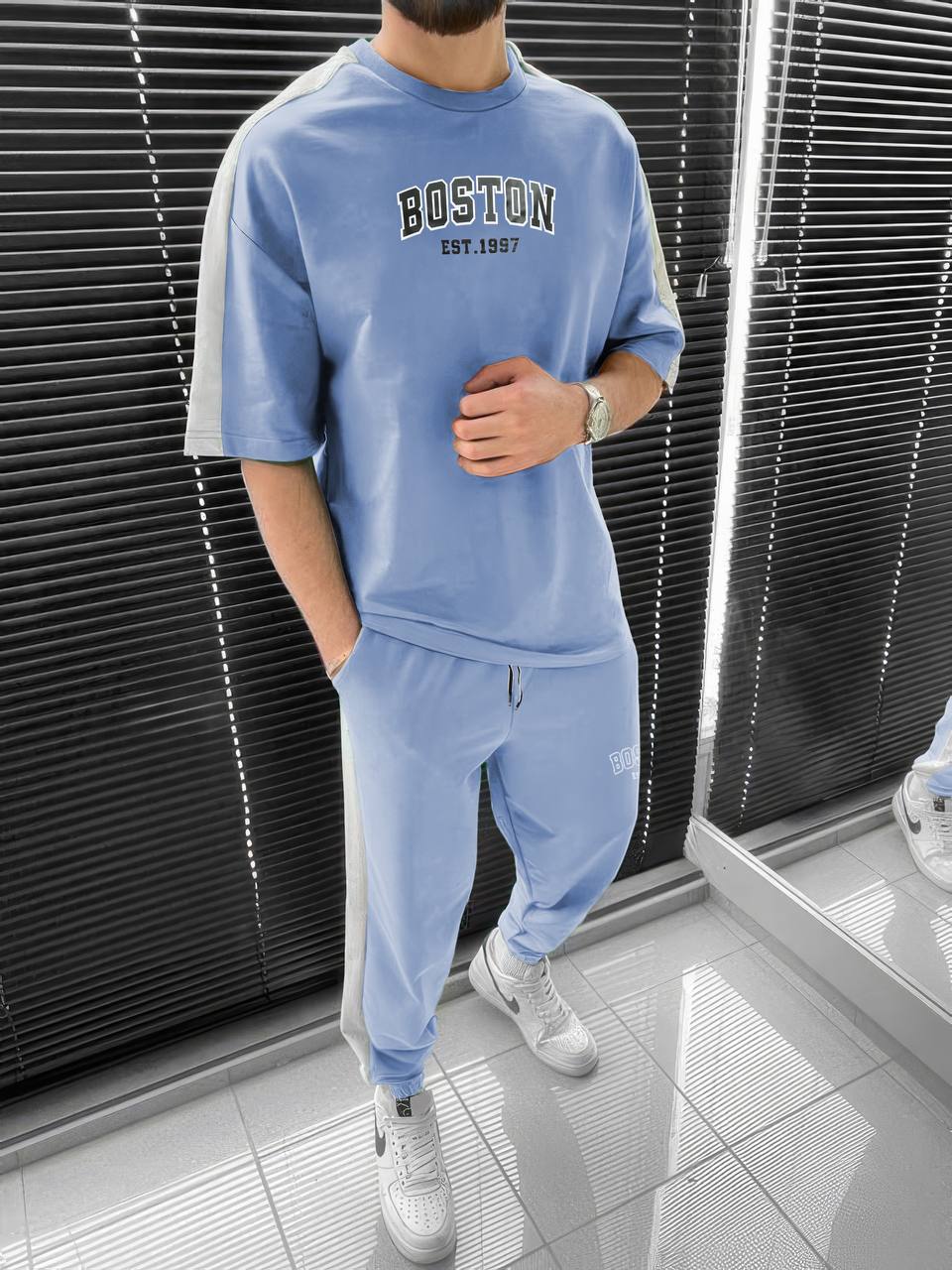 Костюм мужской: Футболка с принтом на груди+штаны с шнурком голубой