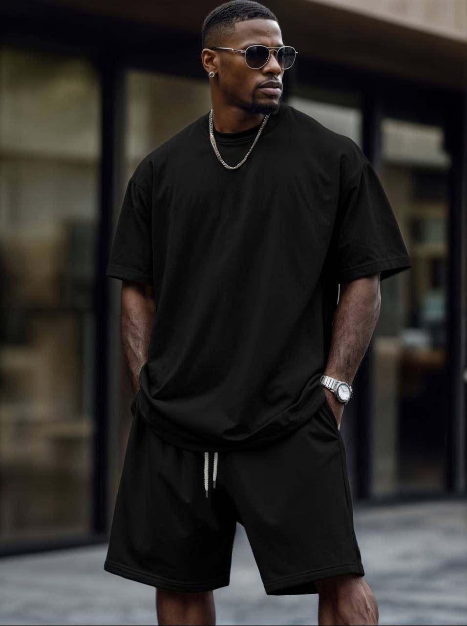Костюм мужской: Футболка свободного кроя с округлым вырезом + шорты на резинке со шнурком черный