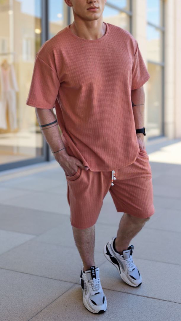 Будьте першим, хто залишив відгук “Костюм мужской: Футболка свободного кроя с округлым вырезом + шорты на резинке светло-коралловый”“