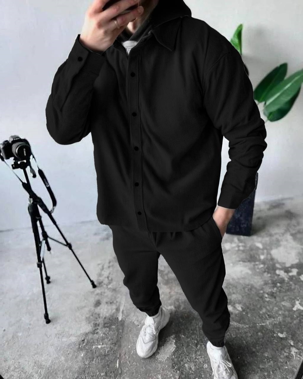 Костюм мужской (рубашка на кнопках+ брюки с карманами+по низу манжета с резинкой) черный