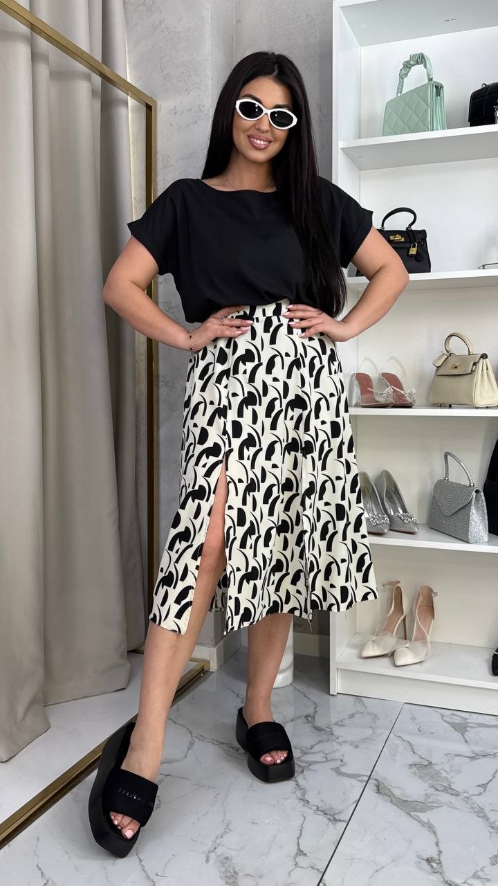 Головна » Магазин » Одяг » Жіночі костюми » Костюм на лето (однотонная футболка+юбка трапеция с разрезами) черный+белый принт
