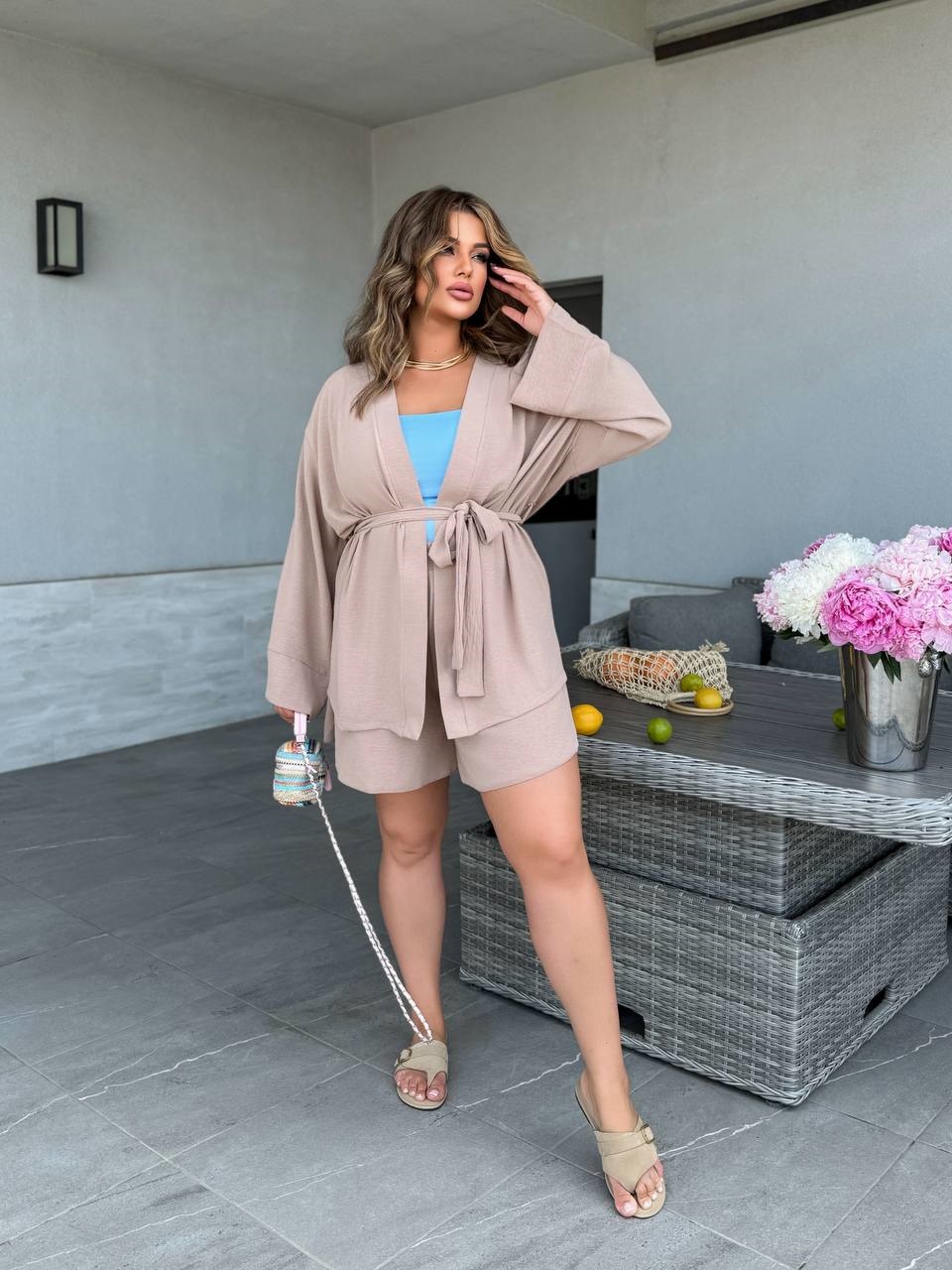 Костюм на лето свободного кроя (шортики+кардиган без пуговиц под пояс) капучино
