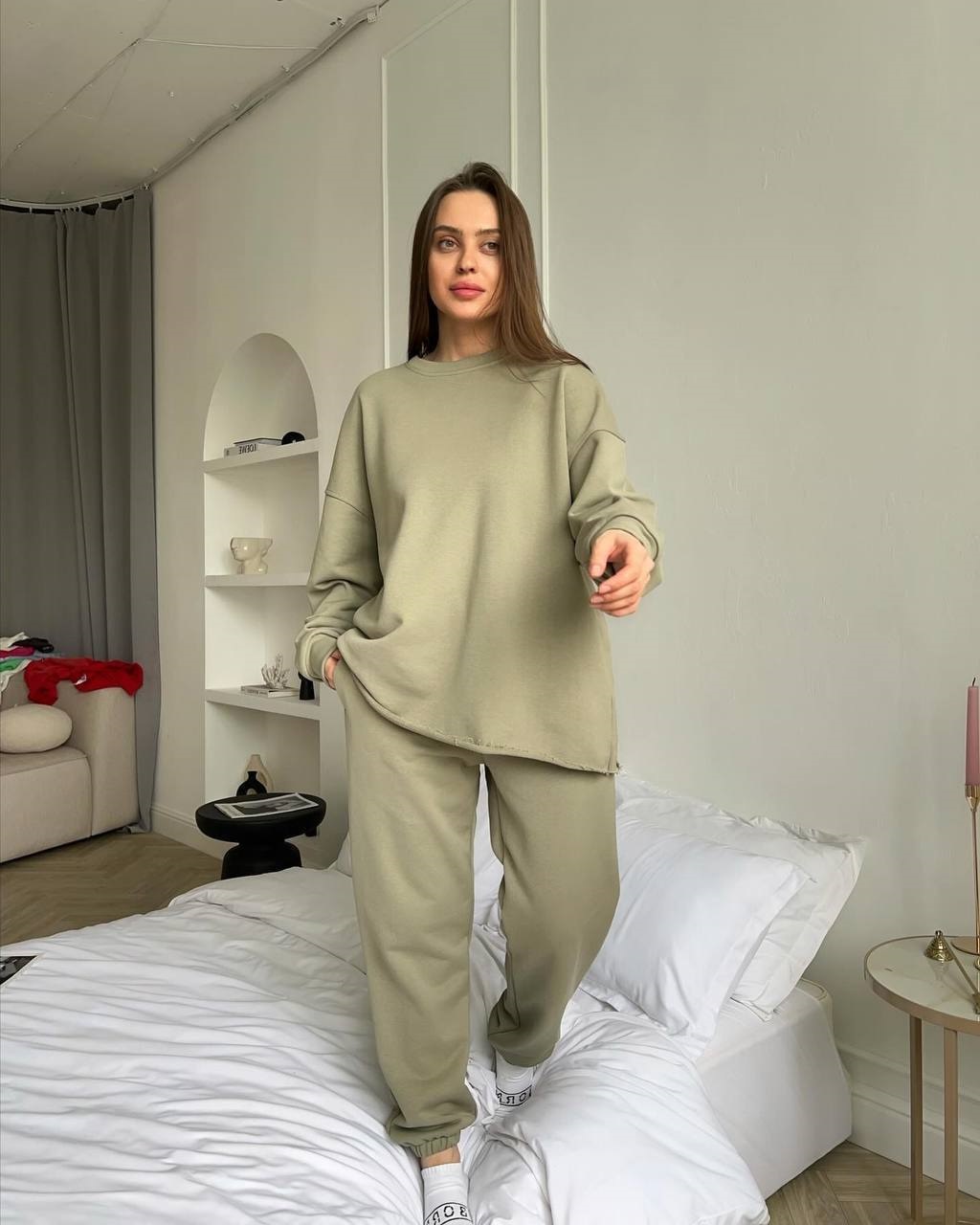 Костюм (объемное худи с необработанным низом+классические джоггеры) олива