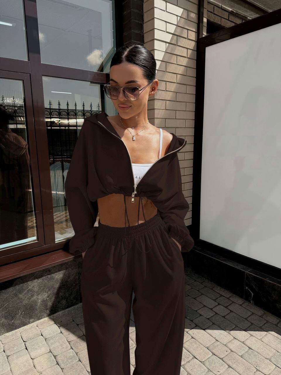 Худые на молнии, ДВОЙНОЙ капюшон, снизу фиксаторы на резиночках; штаны высокой посадки, рабочие карманы, снизу также на фиксаторах (можно стягивать)
