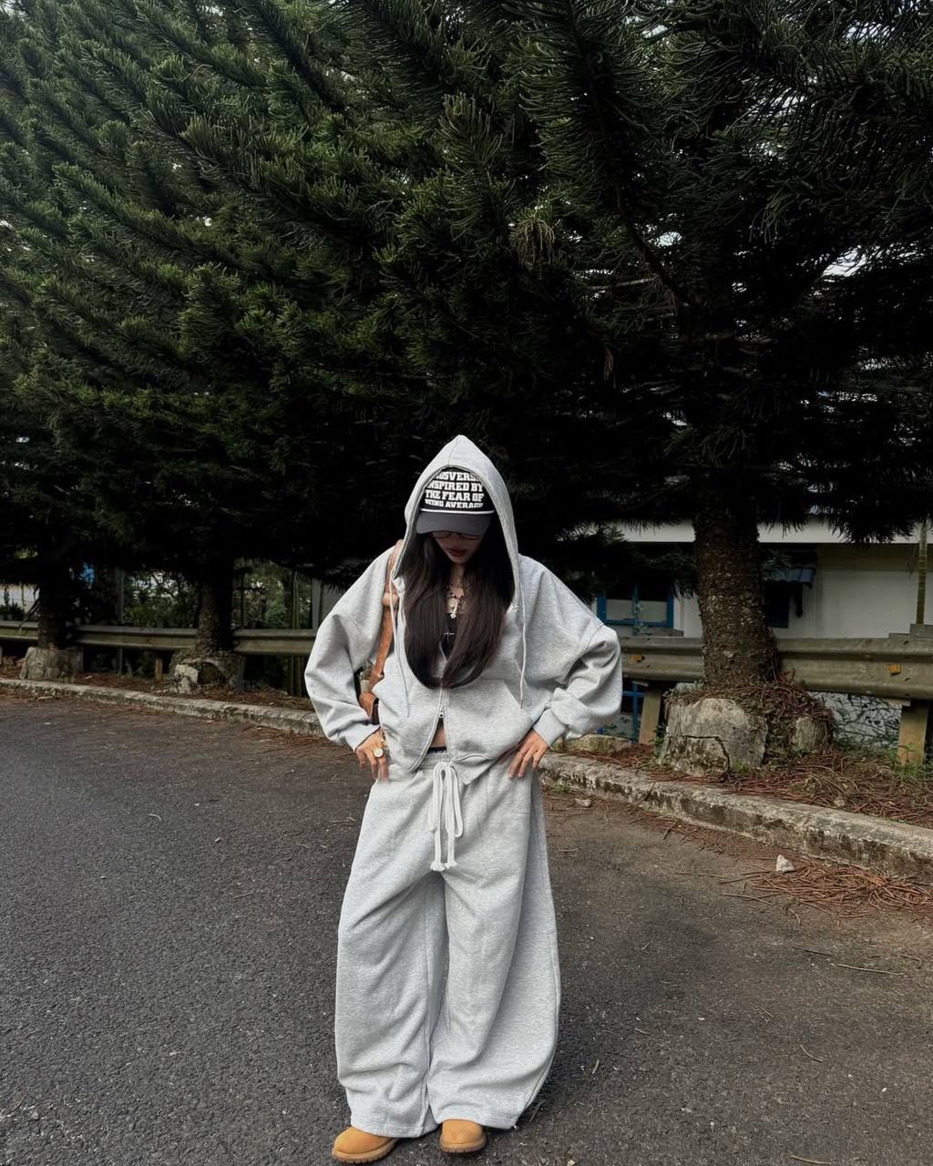 Оверсайз худи с капюшоном и широкие брюки с утяжкой – максимально удобный крой для любого типа фигуры.