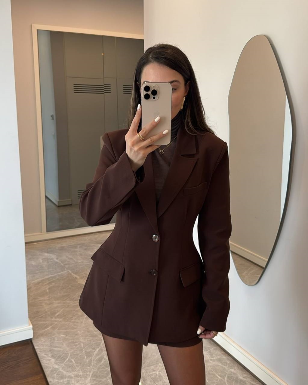 Костюм (пиджак приталенного силуэта удлиненный+прямая мини юбка) шоколад