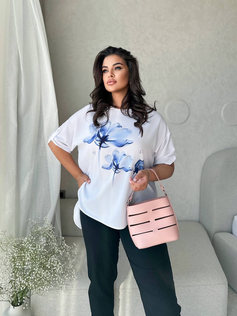 Костюм повседневный .Блуза свободного кроя с сублимацией +брюки с высокой посадкой.