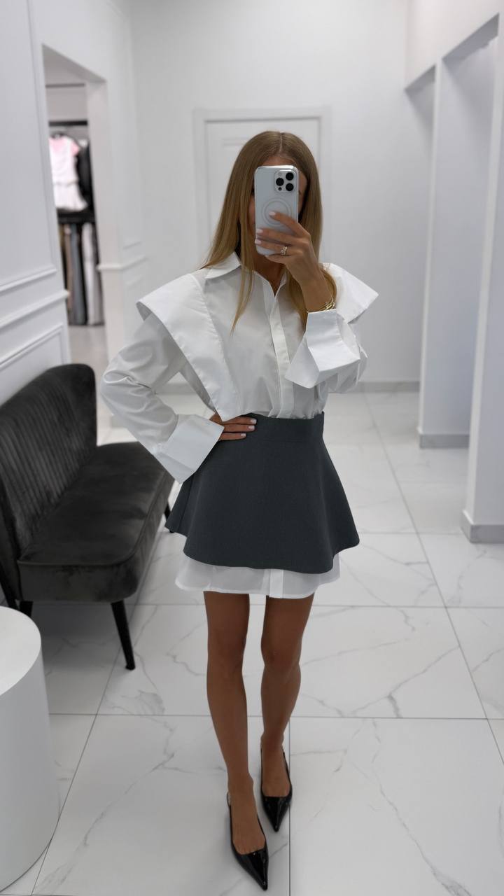 Белая рубашка с широкими акцентными манжетами и объемными плечевыми деталями придает образу легкости и женственности. Мини-юбка трапециевидного кроя идеально подчеркивает фигуру и создает выразительный силуэт.