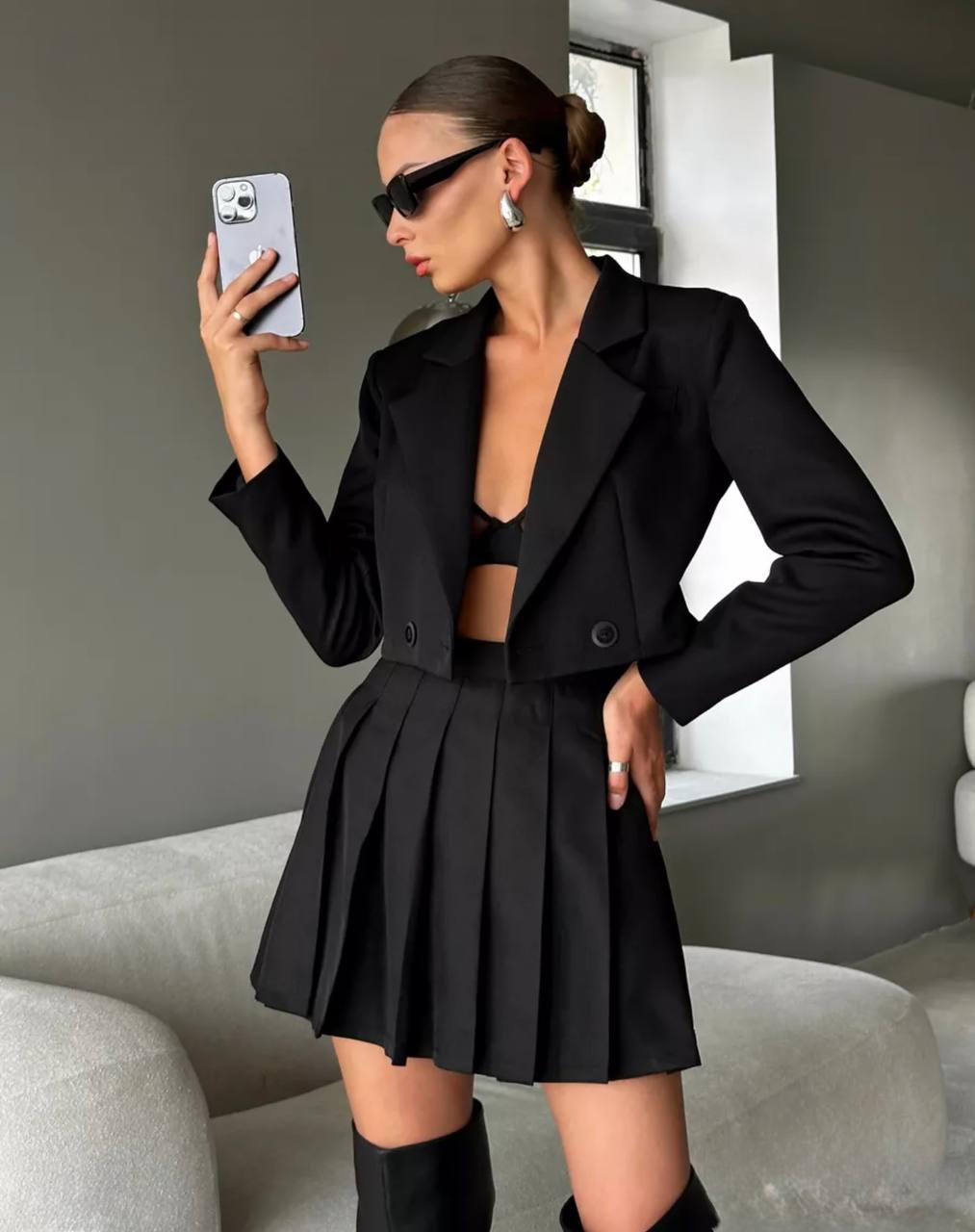 Серый костюм с коротким жакетом и плиссированной мини-юбкой это идеальный баланс между элегантностью и современной модой. Лаконичный крой подчеркивает фигуру, а плиссировка придает образу динамики и женственности.