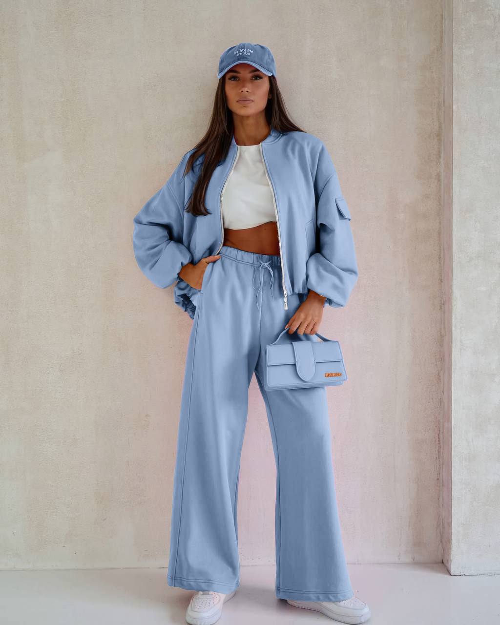 Костюм с просторными брюками на резинке со шнурком и карманами и укороченной кофтой со спущенным плечом и резинкой по низу.