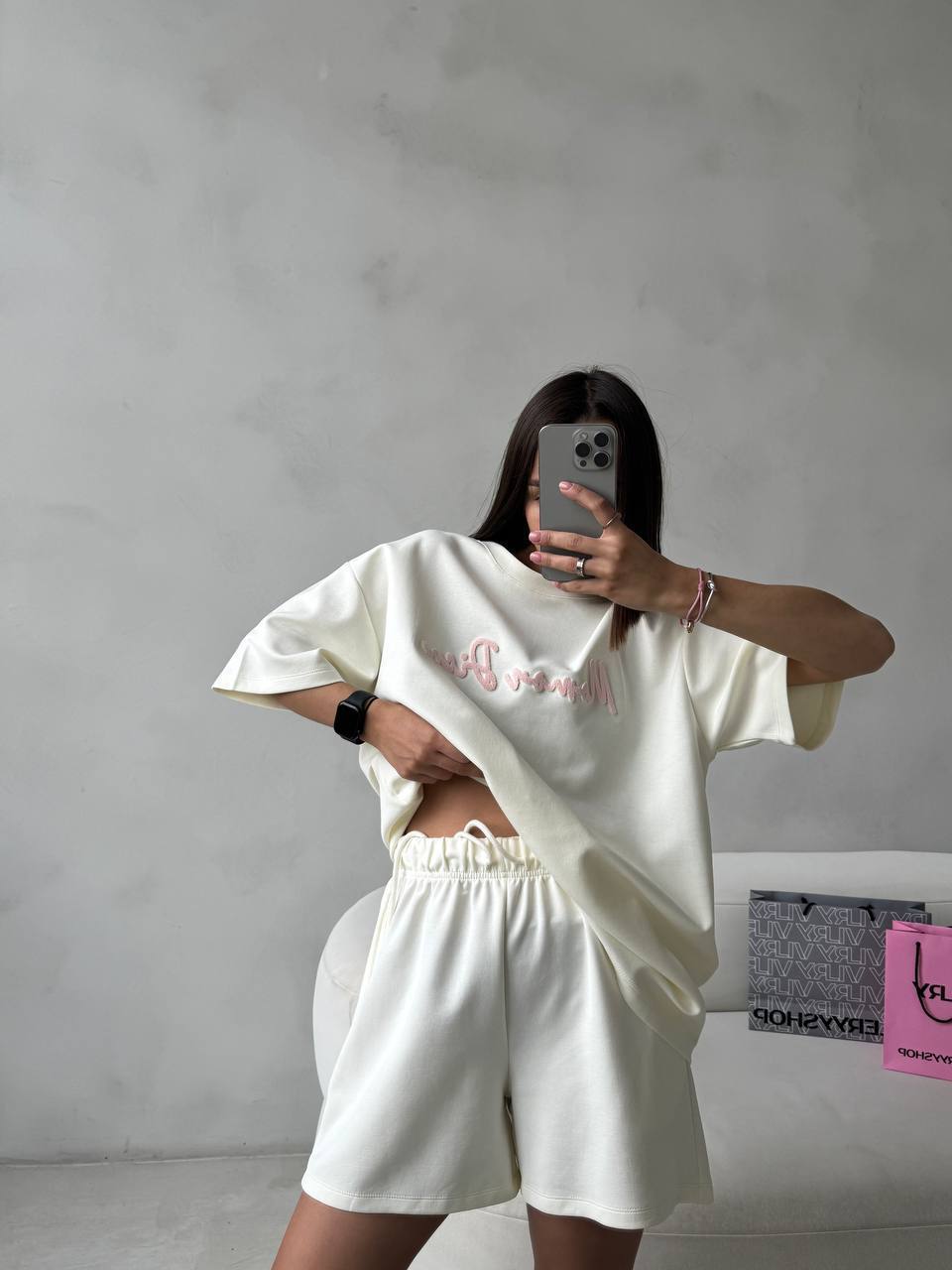 Костюм с рельефным принтом (Футболка и шорты в стиле over) молочный