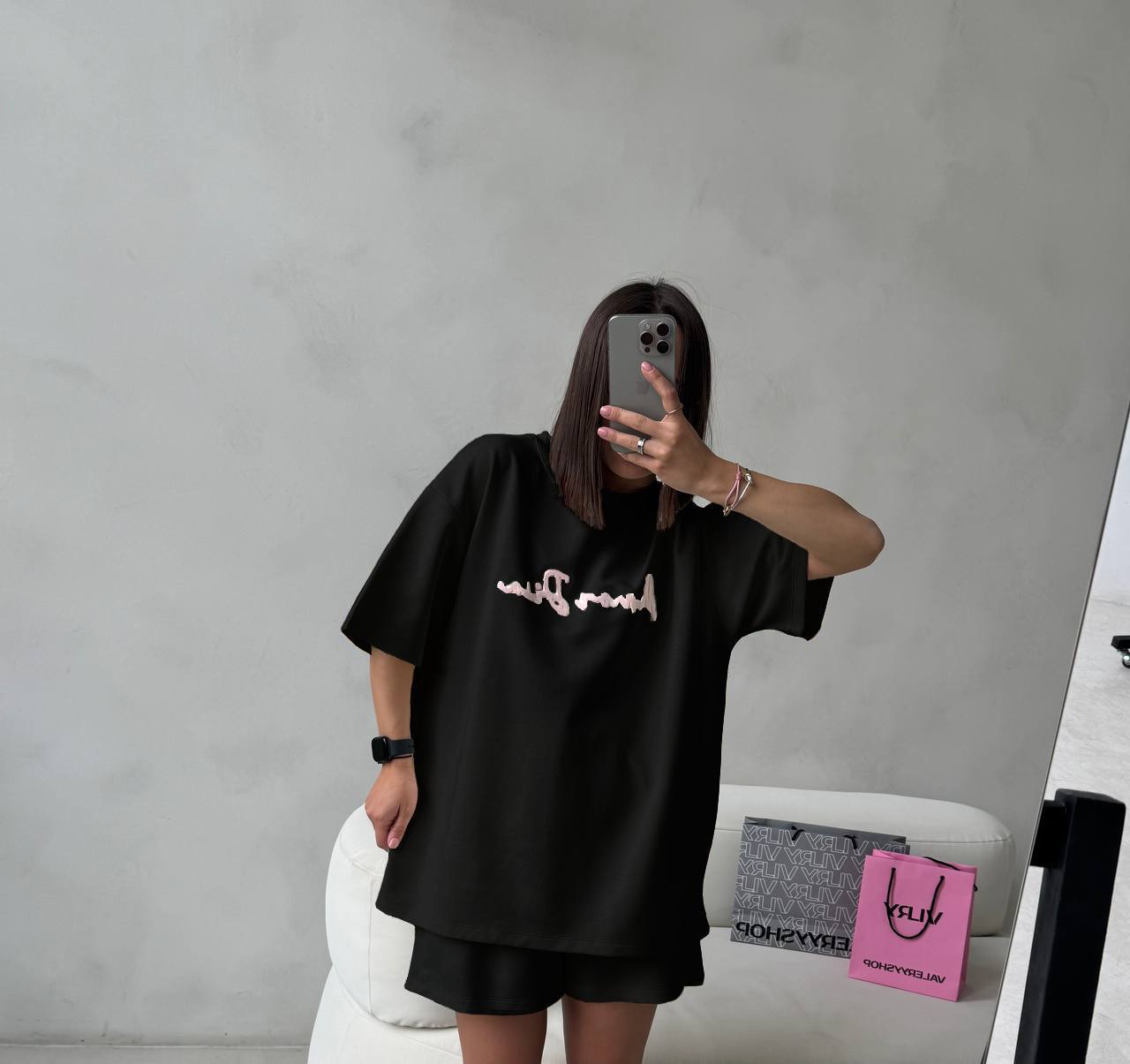 Костюм с рельефным принтом. Футболка и шорты в стиле over, быть стильной в комфорте – возможно именно с этим костюм.