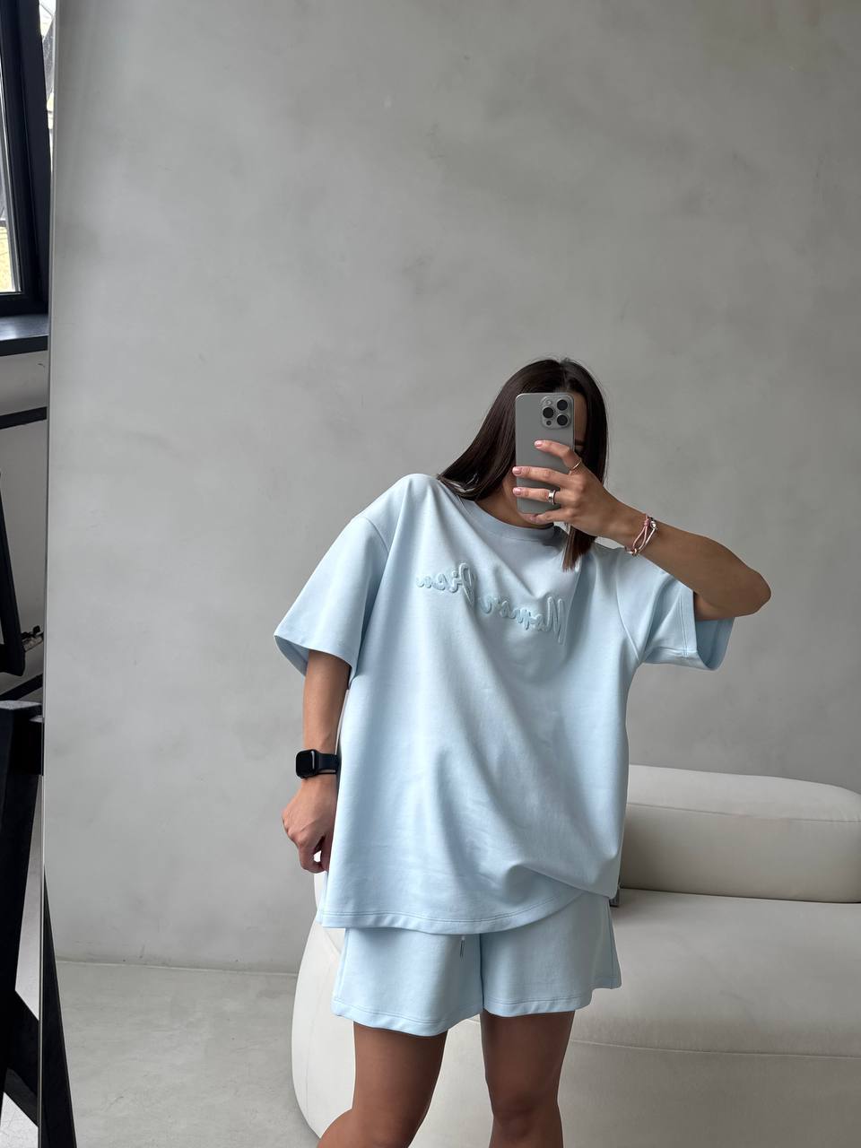 Костюм с рельефным принтом. Футболка и шорты в стиле over, быть стильной в комфорте – возможно именно с этим костюм.