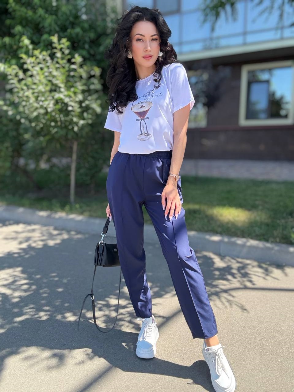 Головна » Магазин » Одяг » Жіночі костюми » Костюм (шелковистые брюки со стрелками+футболка с накатом) темно-синий