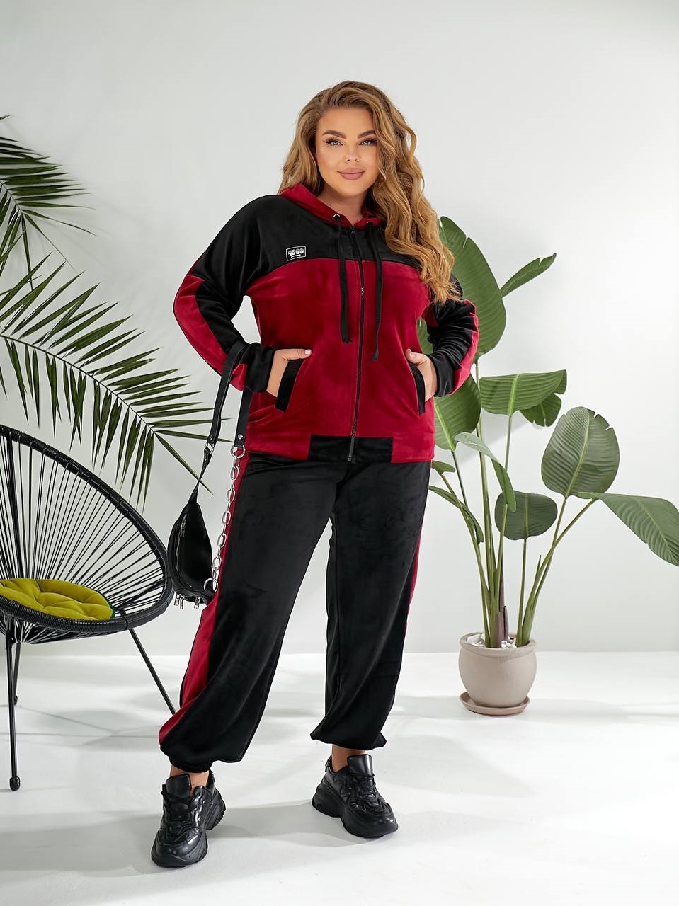 Костюм спортивный из велюра (кофта с карманами и капюшоном+брюки с резинкой по низу) красный+черный