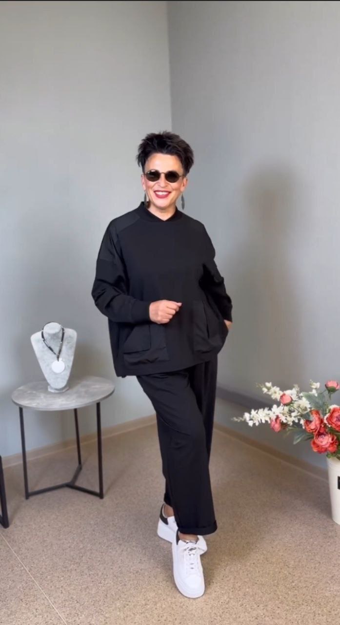 Стильный костюм свободного кроя. Брюки на резинке, есть карманы, можно носить под любую обувь. Трикотаж имеет растяжимость. Идеальный костюм на каждый день.