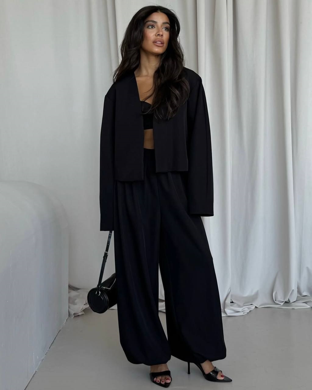 Костюм свободного кроя (укороченный пиджак с широкими плечами+ брюки низ на резинке) черный