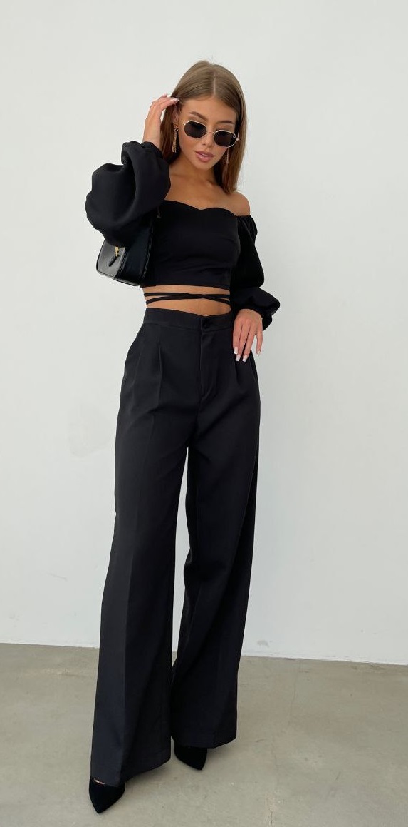Брюки на высокой талии, сзади на поясе идет резинка.