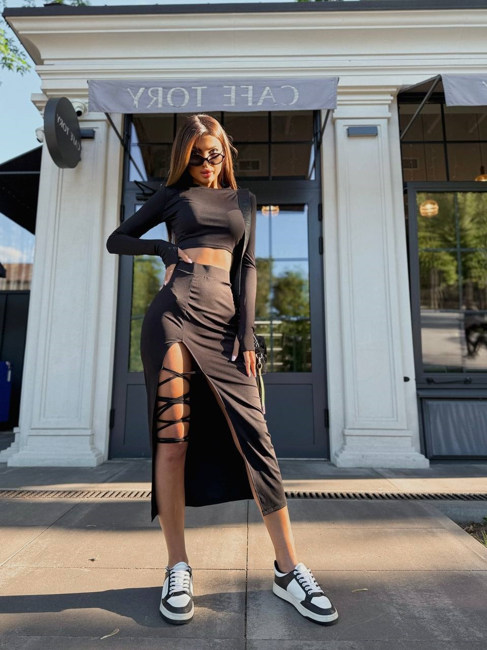Топ с длинным рукавом и разрезом на пальчике и юбочка миди с открытой ножкой на завязках.