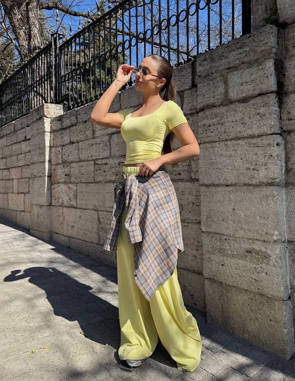 Костюм Топ с вырезом + длинные широкие штаны палаццо с карманами лимон