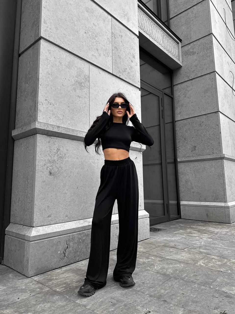 Костюм трикотажный (укороченная кофточка+ брюки свободного кроя) черный
