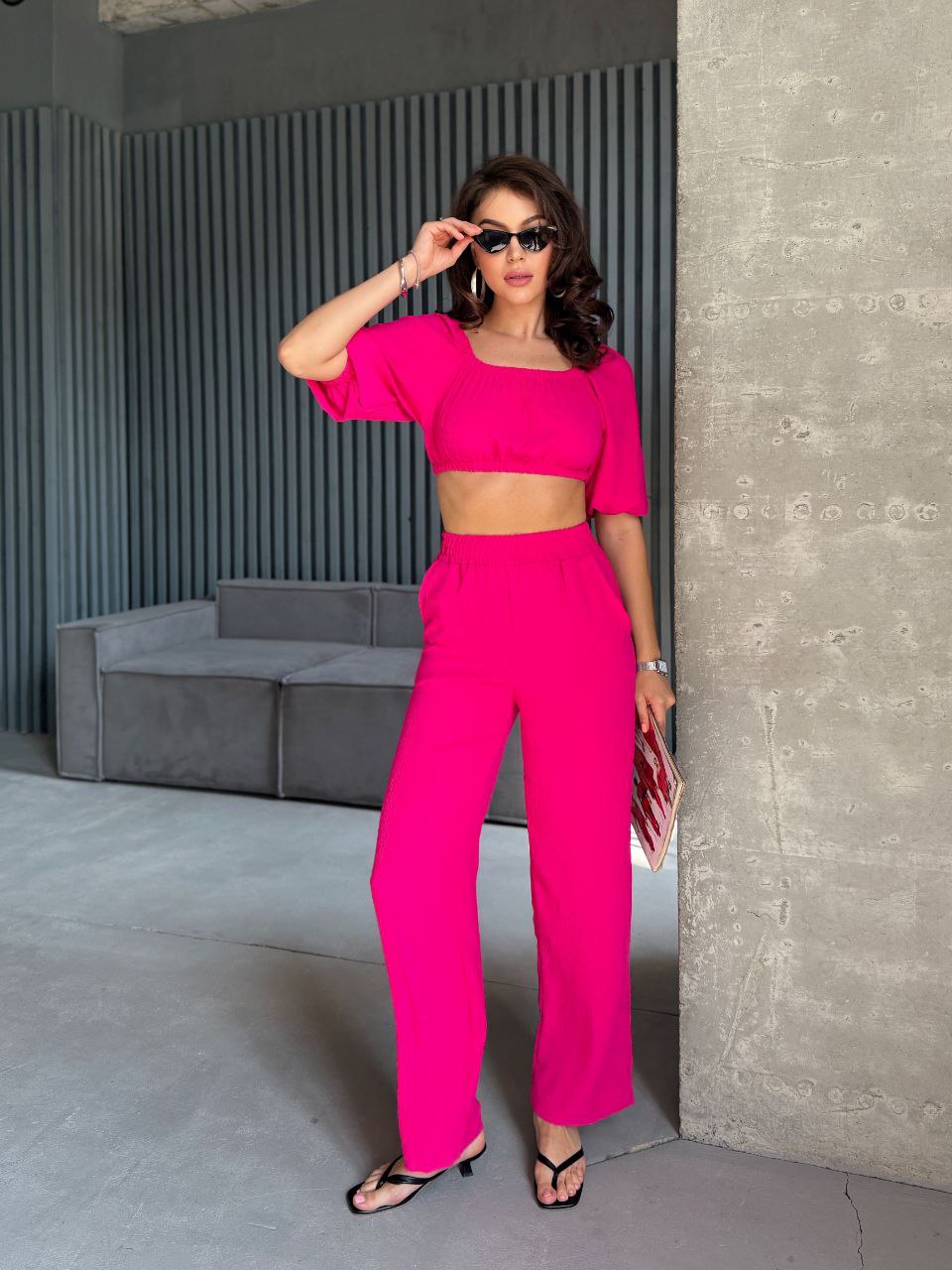 Костюм тройка: Брюки + ТОП + Шорты (Креп Жатка) малина