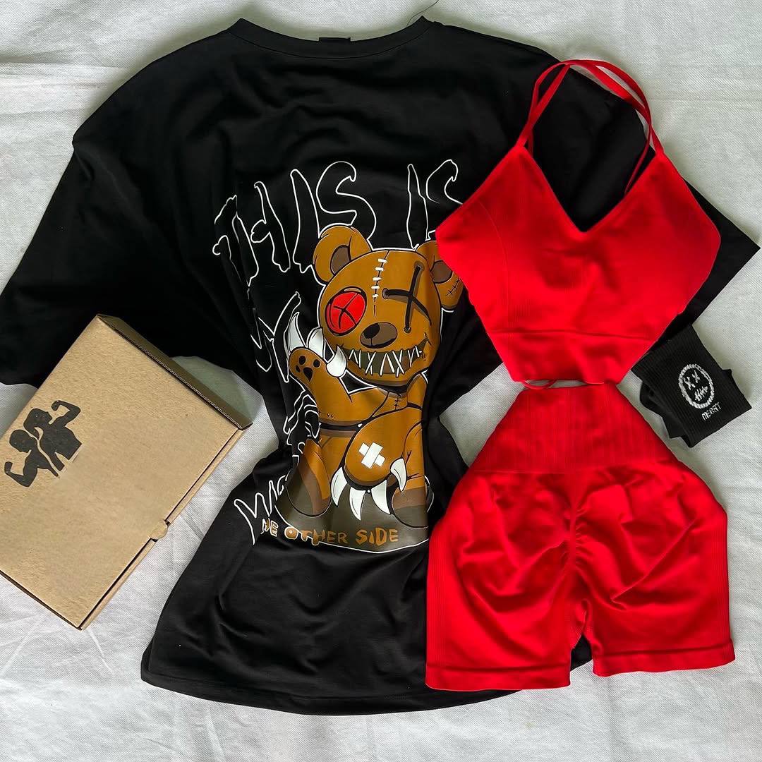 Будьте першим, хто залишив відгук “Костюм тройка: футболка oversize + топ + велосипедки черный+красный”“