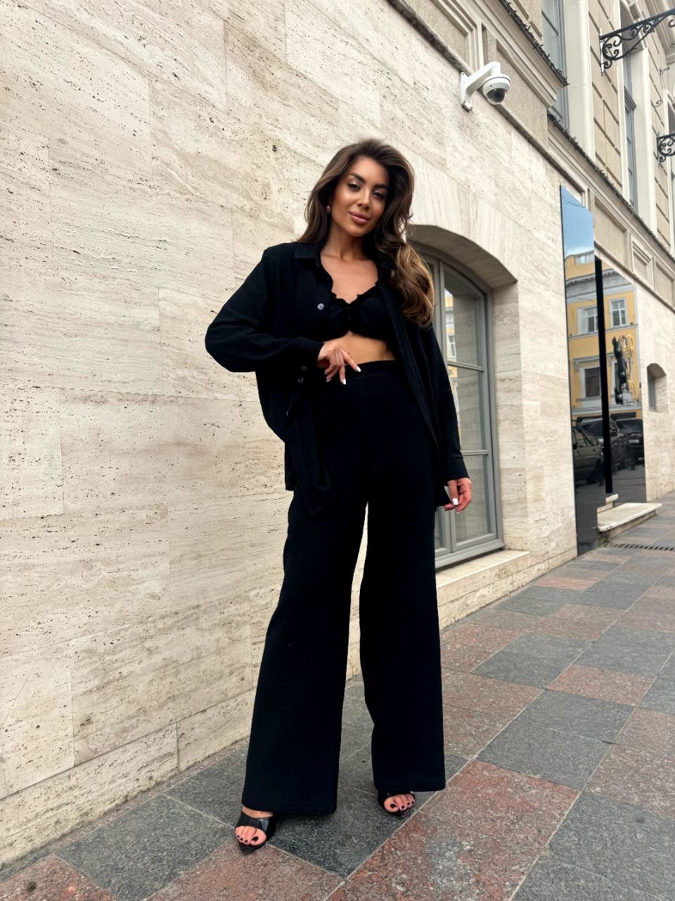 Костюм тройка из легкой натуральной ткани (топ+рубашка+брюки) черный