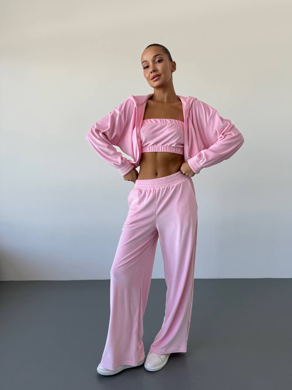 Костюм-тройка: кофта с двойным капюшоном+топ+прямые штаны розовый барби