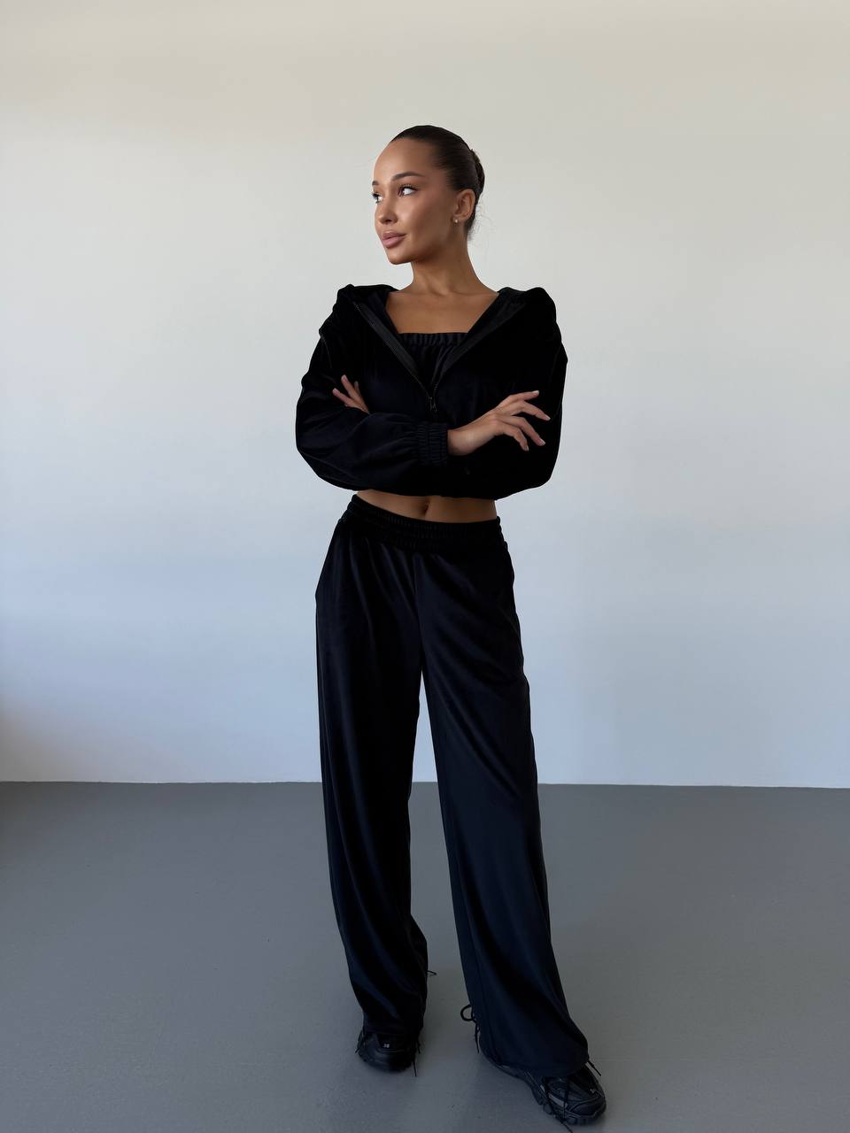 Костюм-тройка: кофта с двойным капюшоном+топ+прямые штаны черный
