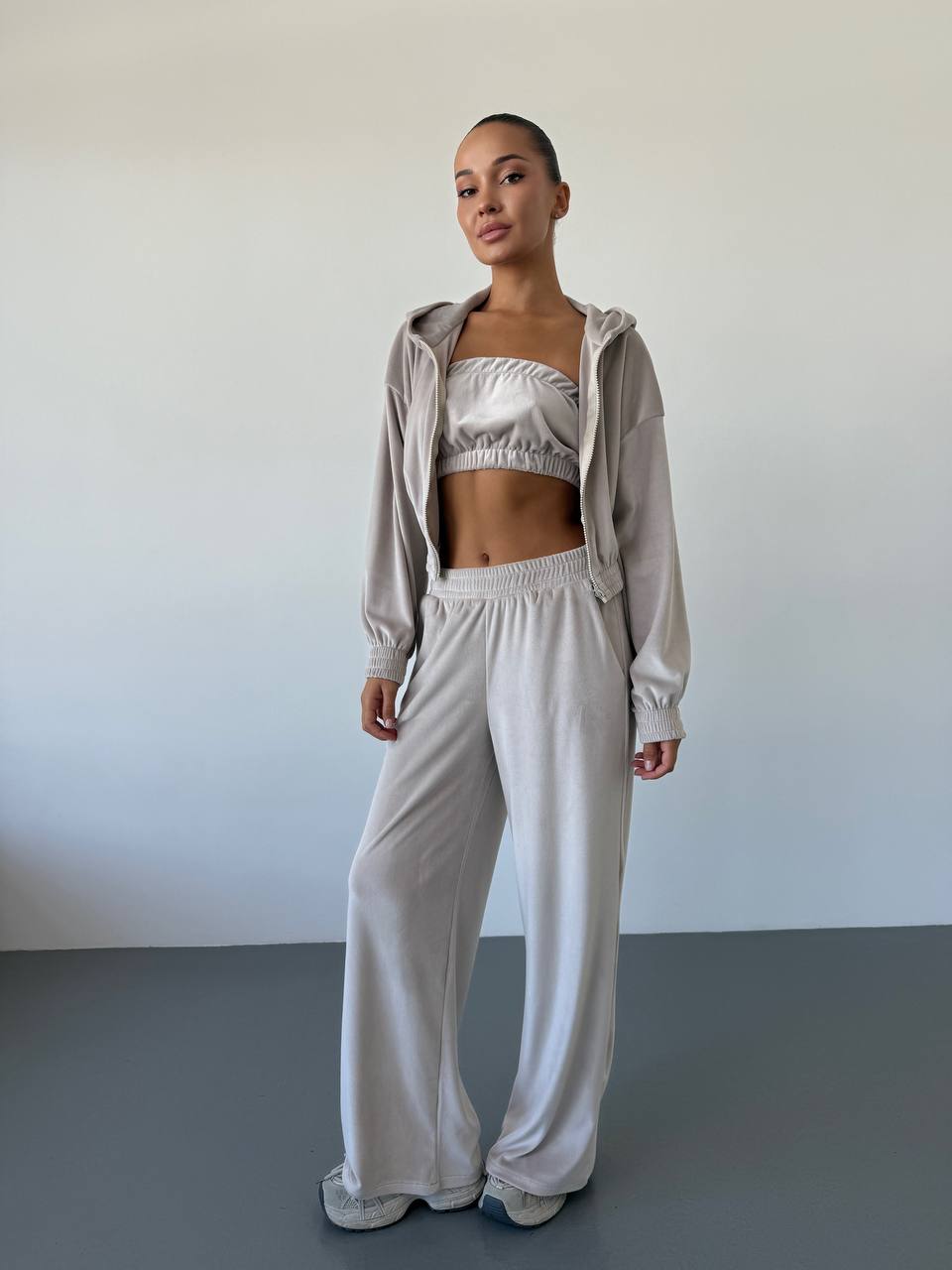 Костюм-тройка: кофта с двойным капюшоном+топ+прямые штаны бежевый