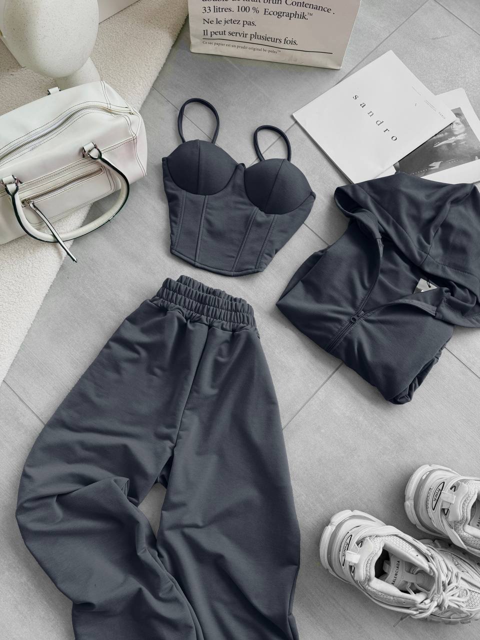 Костюм тройка: кофта + топ/корсет + джоггеры графит