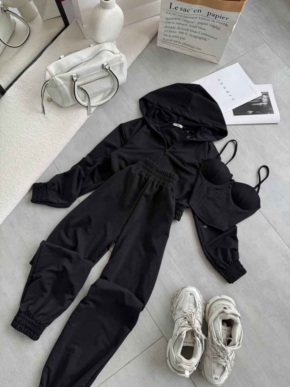 Костюм тройка: кофта + топ/корсет + джоггеры черный