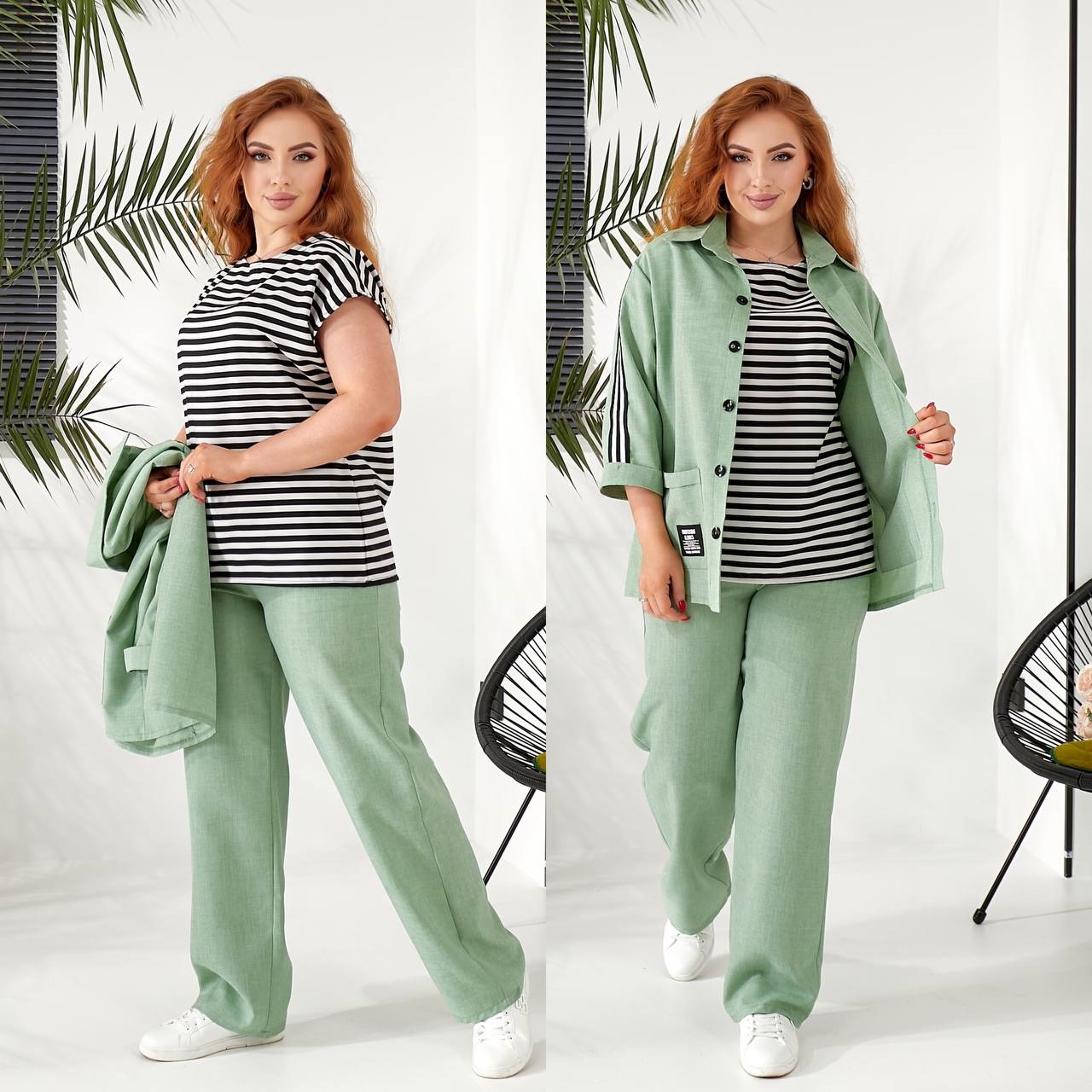 Костюм тройка (льняные рубашка с лампасами+брюки прямого кроя+футболка в полоску) оливка