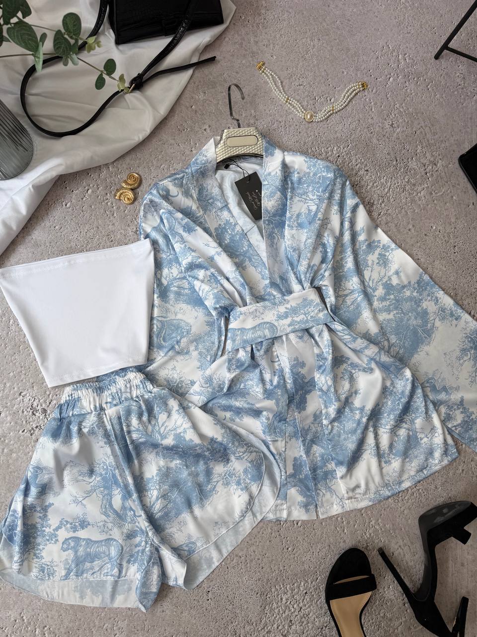 Этот костюм тройка находка на лето – кимоно с поясом+топ+шорты. Легкая приятная к телу ткань, не просвечивается. Топ хорошо тянется и садится по фигуре. Шорты на резиночке с разрезами.